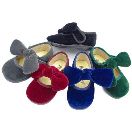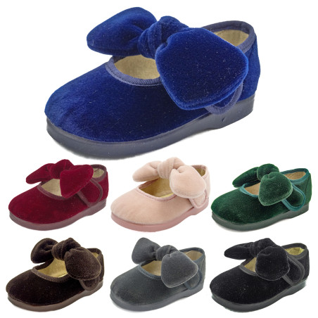 Mercedita para niña de terciopelo con cierre de velcro con un lazo en la correa que se puede quitar.